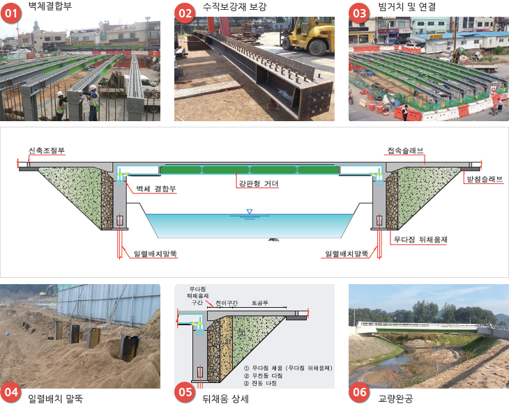 교량에 신축이음장치 및 교량받침을 설치하지 않고 상부구조와 교대부, 말뚝기초 등을 일체로 시공한 교량으로교대벽체 높이 및 말뚝개수의 감소로 초기공사비와 유지관리비를 절감할 수 있도록한 일체식 교대 교량 공법